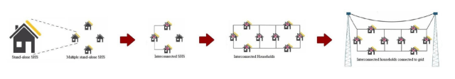 The solar home system (SHS) has emerged as a new and cost-effective way of supplying power to remote off-grid households. SHS is typically comprised by DC sources (Solar Pico Systems etc.), loads (LED Lamps, radios, mobile phone charging) and a small storage system (batteries). The possibility of interconnected multiple SHS into small clusters and furthermore the interconnection of multiple clusters together is promising for electrifying large rural areas.
