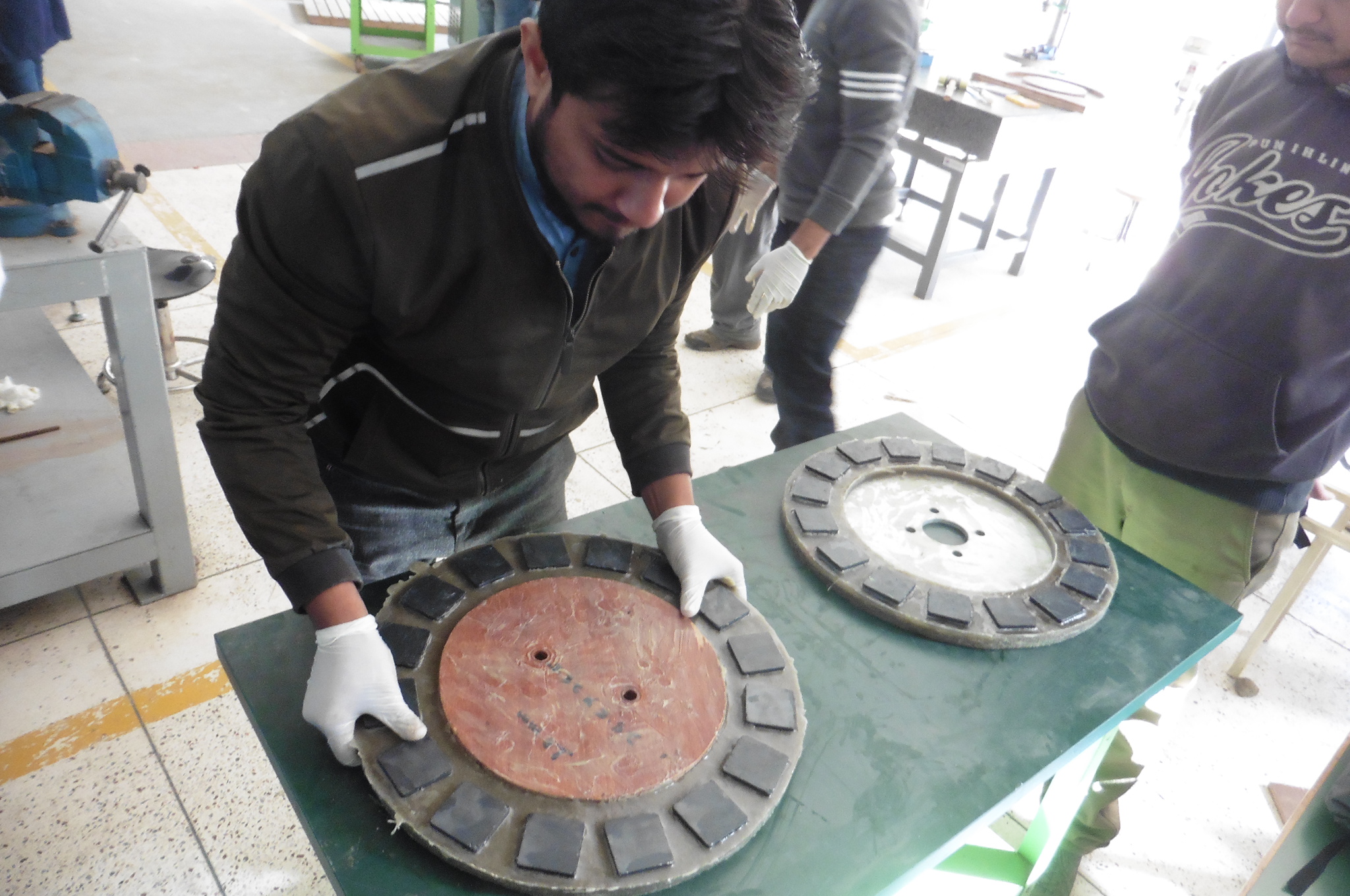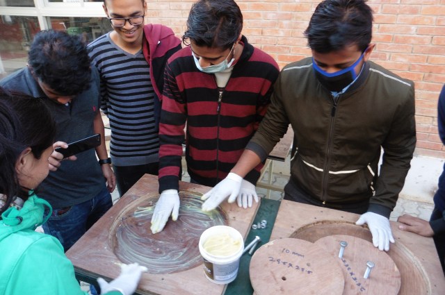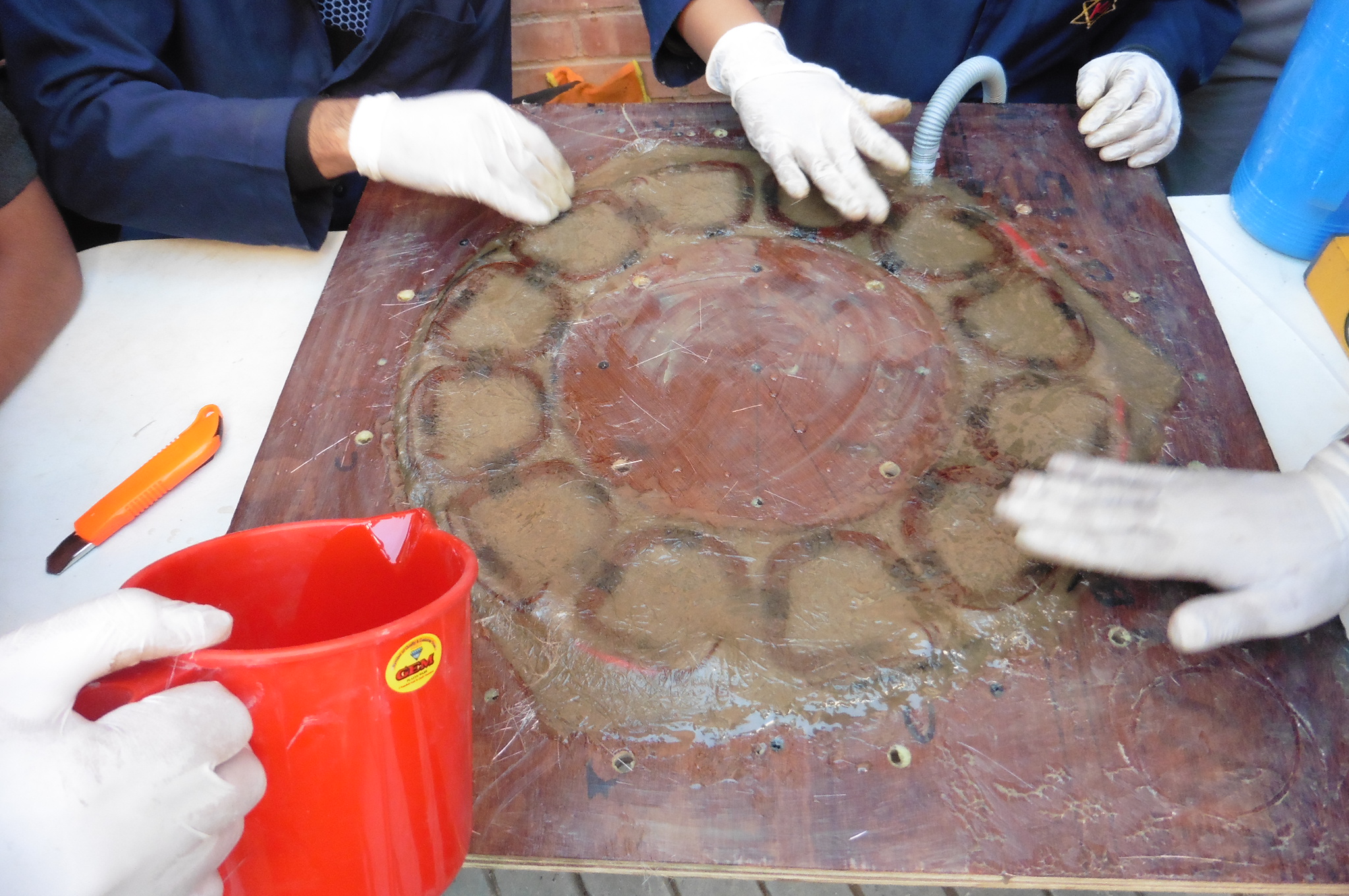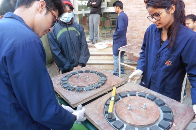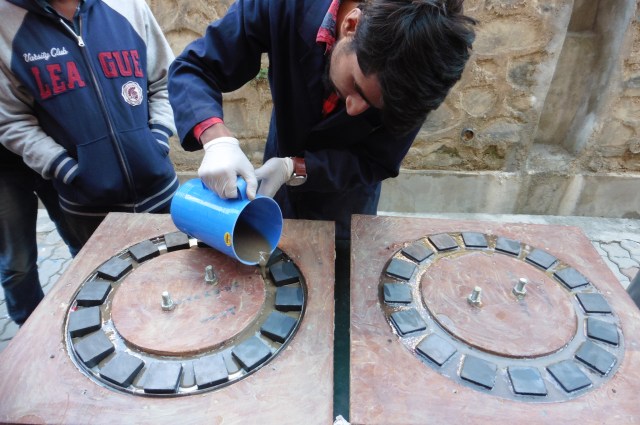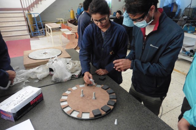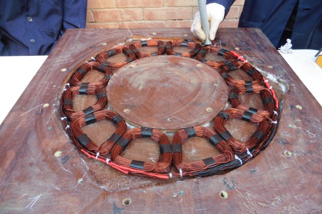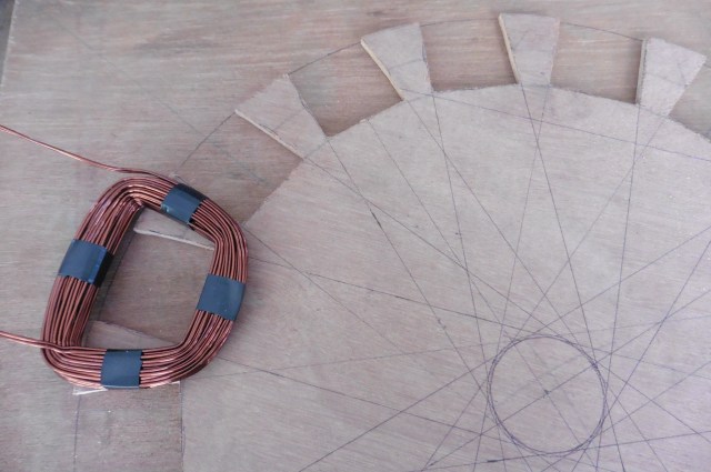 A coil placed on top of the magnet positioning jig showing the way magnets pass over coils