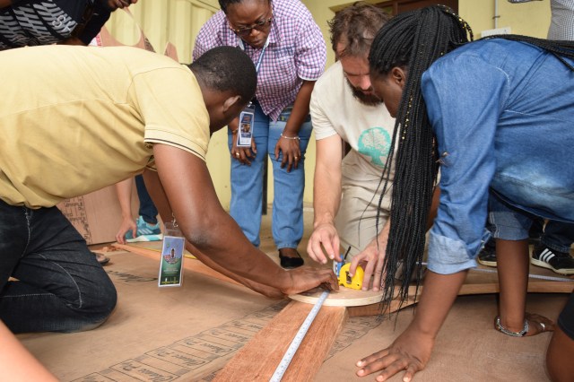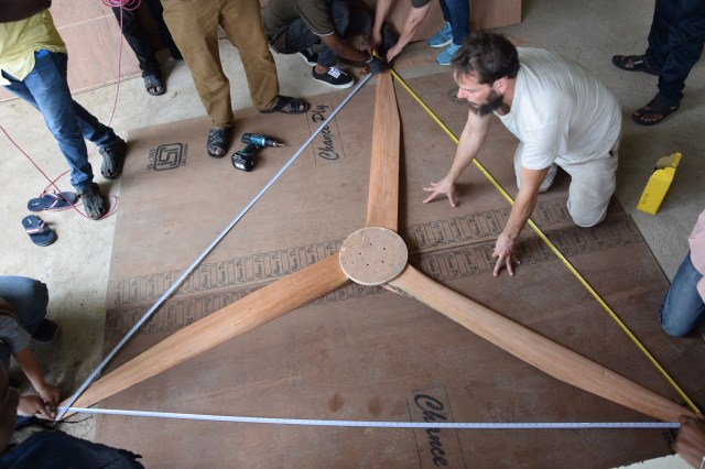 Erecting the wind turbine on a locally manufactured wooden lattice tower