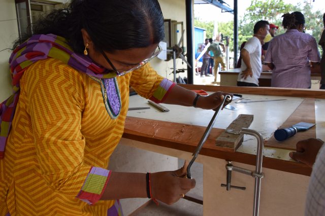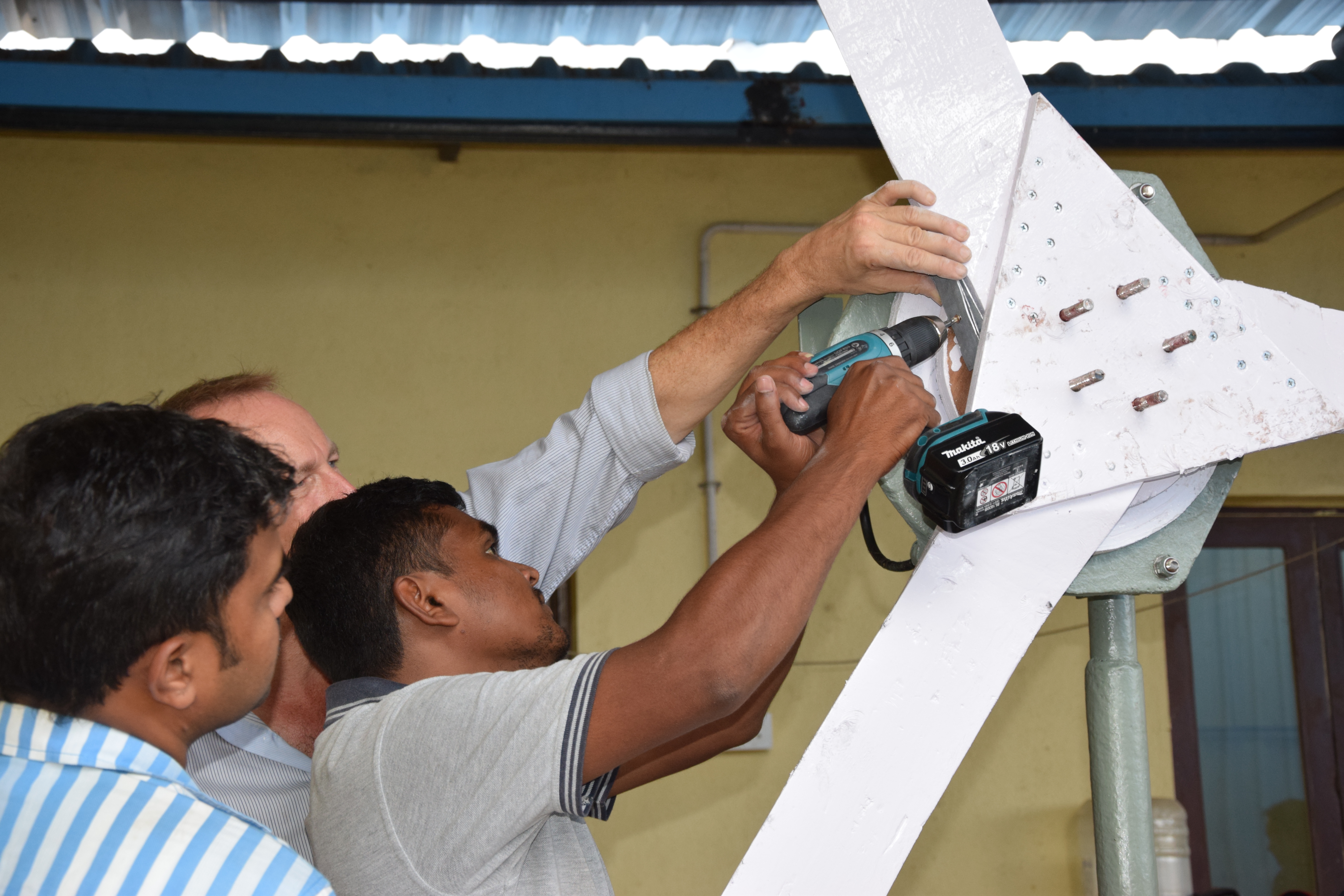 Erecting the wind turbine on a locally manufactured wooden lattice tower