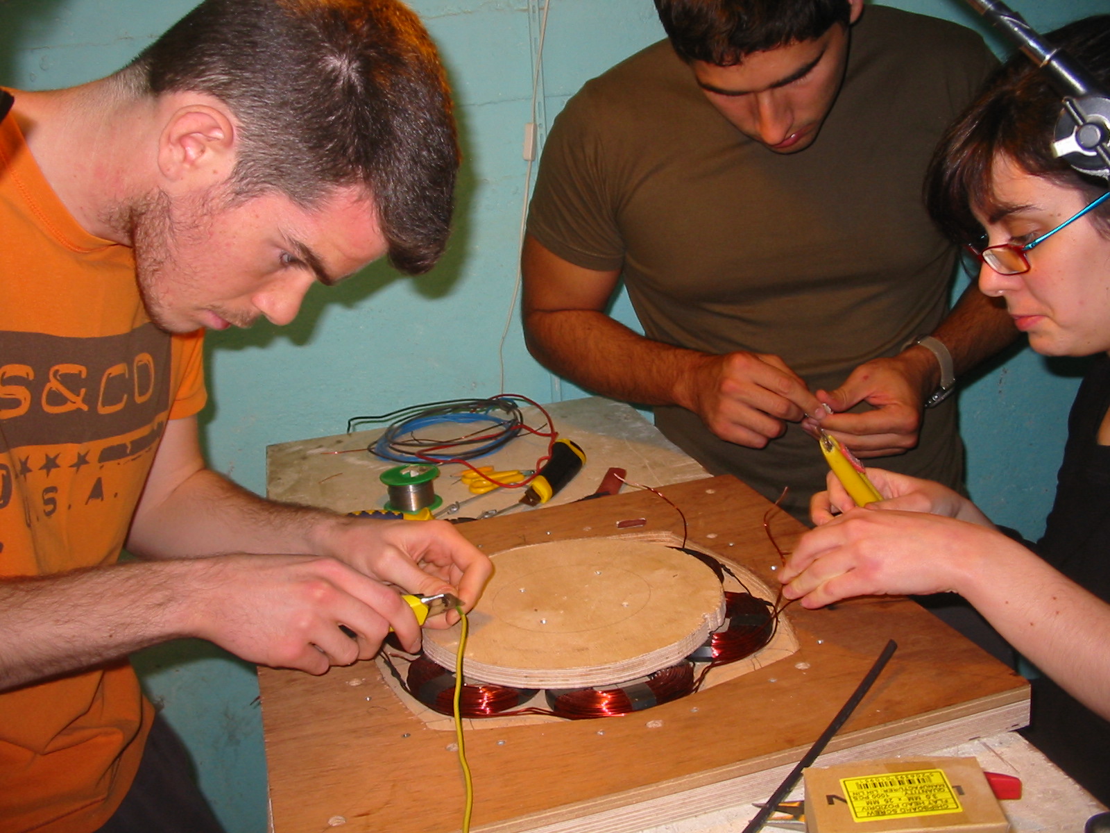 Practical workshops are organised as parts of undergraduate dissertation projects and are open to all students of NTUA. During these workshops small wind turbines are constructed from scratch by the students, a process which provides practical evidence of the ability to locally manufacture these small wind turbines by unqualified constructors. The students have the chance to get acquainted with different tools and techniques such as cutting and griding metals, arc welding, using hand carving tools for wood and making resin moulds. Also they get acquainted with using different materials such as wood, resins, iron and copper by winding coils, carving the rotor blades, casting the stator and rotors of the generator and welding the metal frame. To this date, four small wind turbines for battery charging and grid connection have been manufactured, with rotor diameters from 2.4m to 6m and two small hydro turbines of 350W nominal power, one for grid connection and one for battery charging with an iron core.